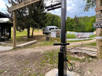Pri vhodu v park je postavljeno servisno stojalo z orodjem za osnovna popravila koles. V kolikor imaš s kolesom večje težave priporočamo servis koles Bikehanic (Stegne).